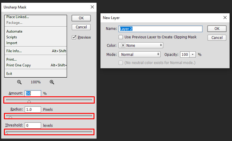 - Select ‘Unsharp Mask’ and use the slider to find an acceptable level. Select ‘OK’ once done.