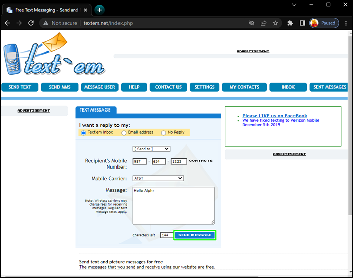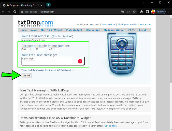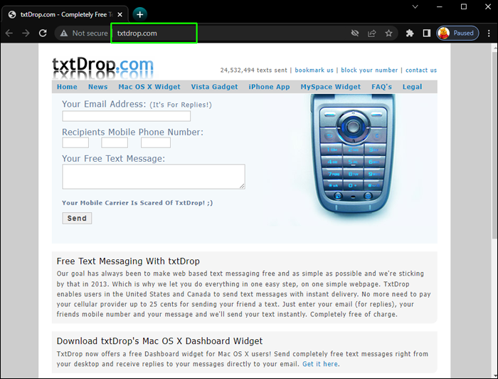 txtDrop enables users from the U.S. and Canada to send text messages for free. The service has existed since 2013, and many people use it today. You don’t have to create an account to use it, but you can provide your email address if you want to receive replies.