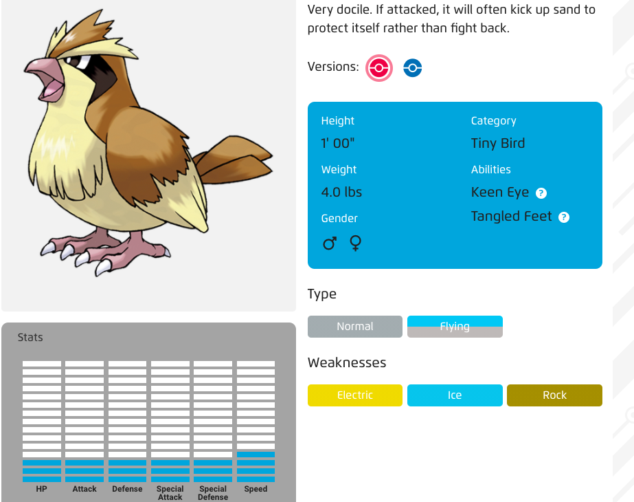Each Pokemon has its own set of Strengths and Weaknesses. Back to our friend the Pidgey, he can fly. But you’re in trouble if he battles another creature with electric, ice, or rock attacks. Before choosing your Pokemon, it’s crucial to understand who you’re fighting and what your Pokemon can do.