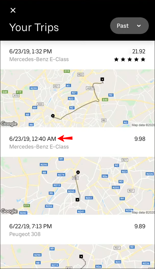 - Tap “Your trips.” Ensure “Past” is selected at the top.