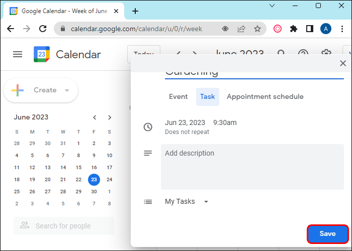And voila, you just created a reminder for yourself. Now you can enjoy your day without having to think about that task, knowing that Google Calendar will remind you on the day and time you selected.