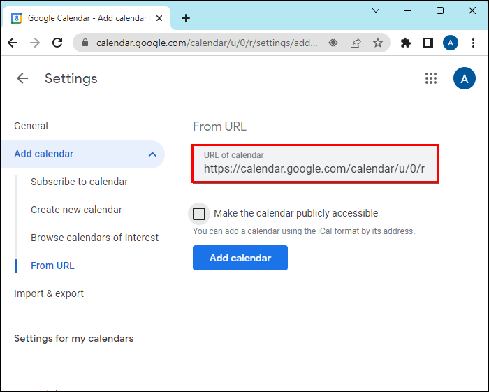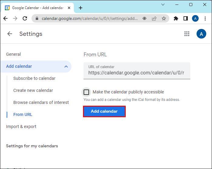 - Select “Add calendar.” On the left hand side there will be a list of calendars and your new calendar will be added to that.