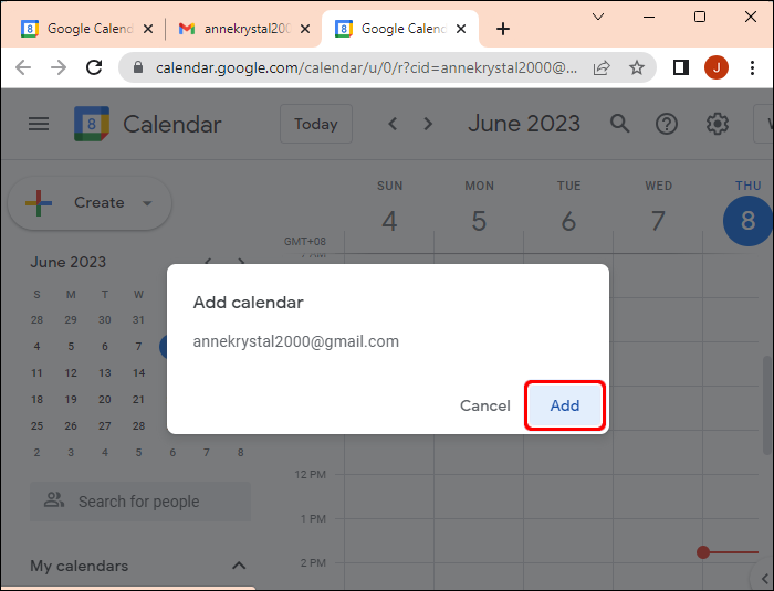 - When Google Calendar opens, a pop-up window will appear to confirm your choice. Click “Add.”