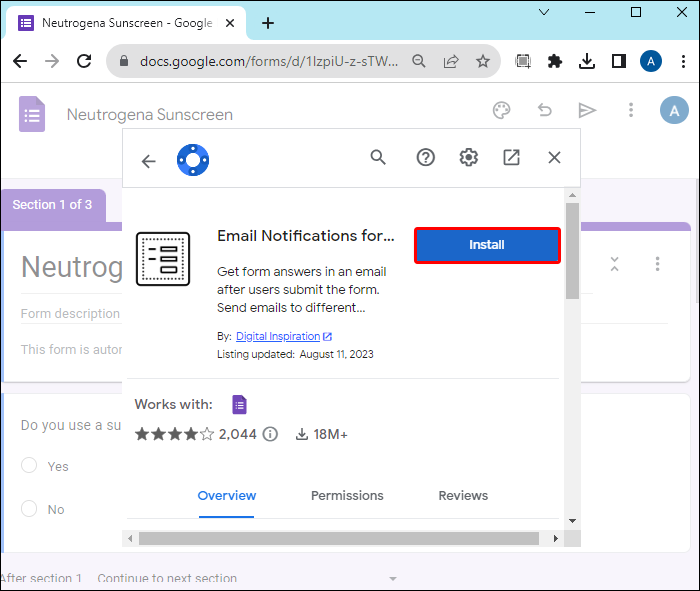 - Select “Install” and follow the on-screen prompts till the installation is complete. When you return to your form, you’ll see an “Add-ons” icon (it resembles a puzzle) at the top. This is where you can access the notification add-on.