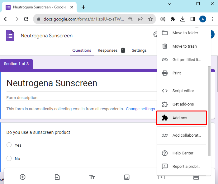 - With your Google form open, navigate to the top and tap the “Add-ons” icon. Select “Email notifications for Google Forms.”