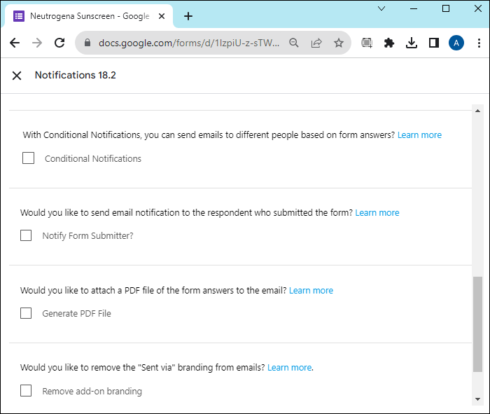 The above settings only send a notification to you, the owner or creator of the form. What if you also want the respondent to receive a confirmation that the submission was successful?
