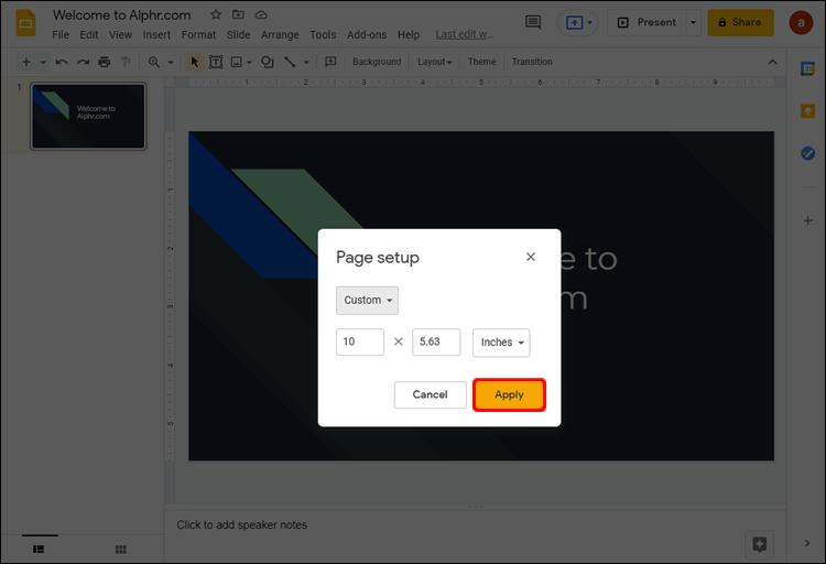 - Select one of the offered slide sizes or choose a custom size. Once you’re satisfied with your choice, hit “Apply” to save changes.