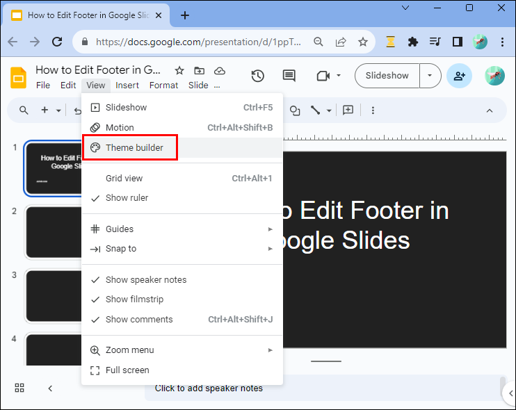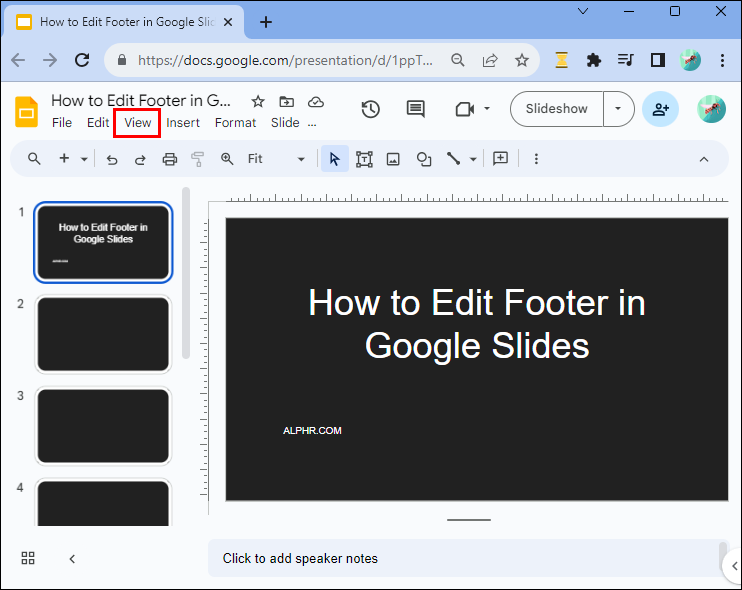- With your Google Slides presentation open, go to the toolbar and tap “View.”