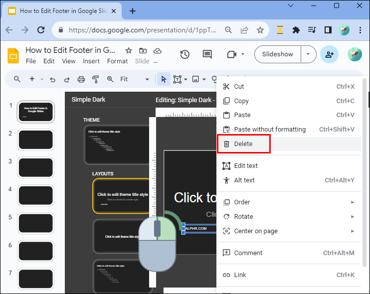 - Hover over the footer and right-click. Choose “Delete” from the menu and exit the master view. This deletes the footer from all the slides.