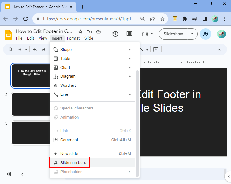 - Choose “Slide numbers” at the bottom of the drop-down menu. A pop-up window will appear on your screen.