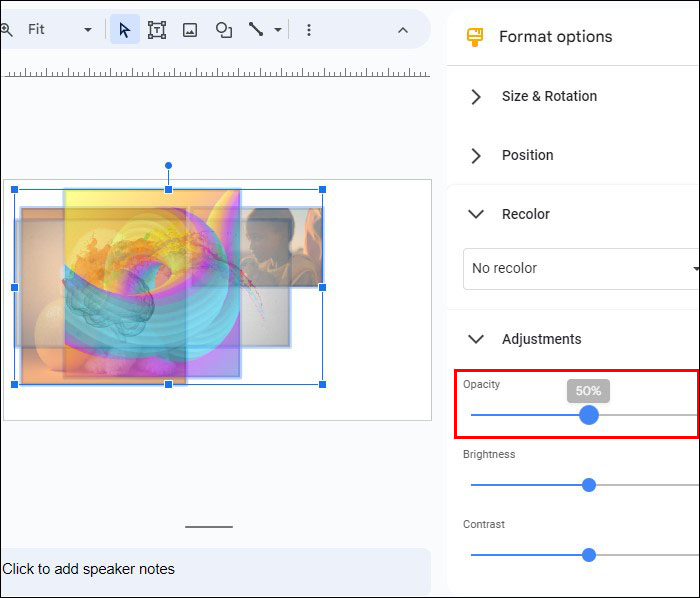 - Select “Adjustment” and click on “Transparency.” Moving the slider to effect to change settings will affect all images.