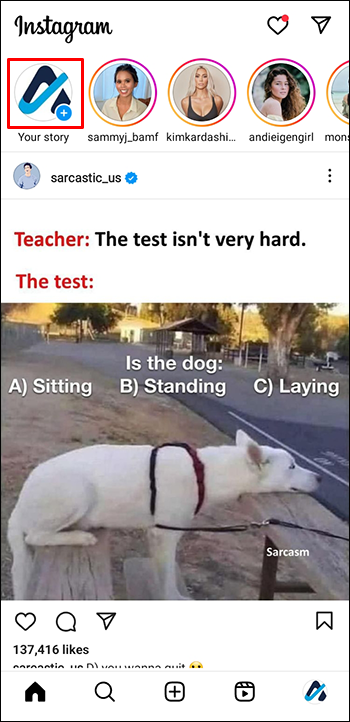 - Click on “Your Story” in the top left corner of your feed or the icon at the bottom of your screen to add your Story.