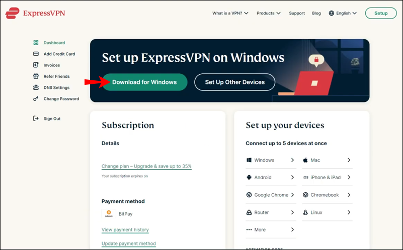 - Under the “Subscription ID” section, click the “Set Up ExpressVPN” button.