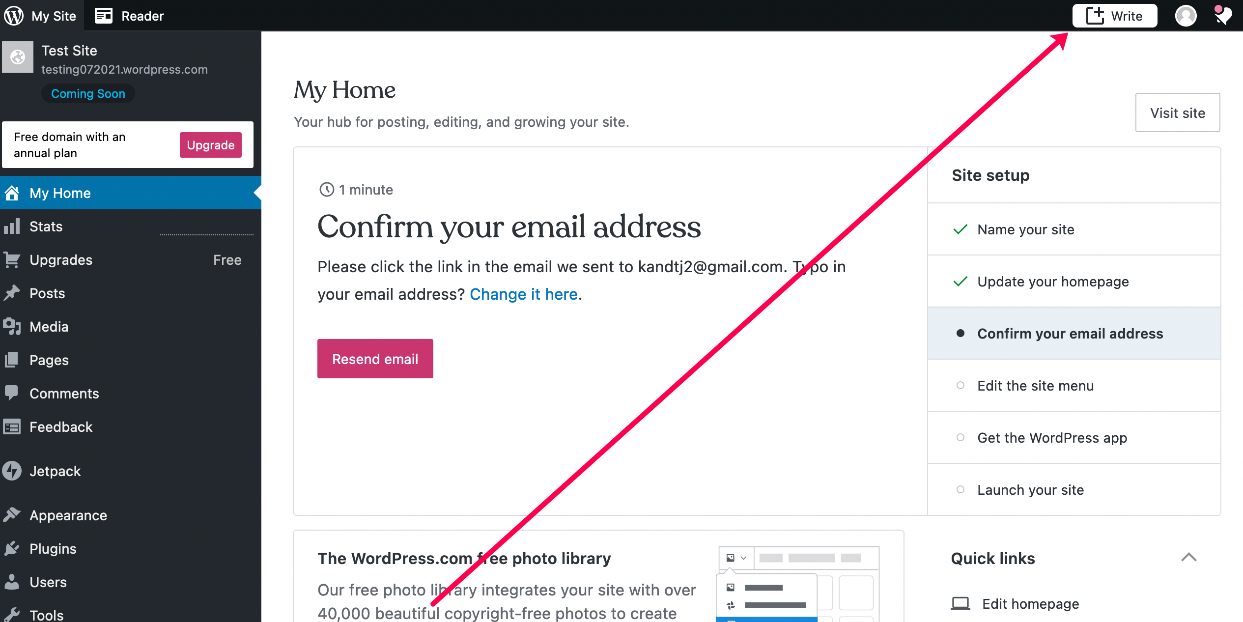 - After setting up your website, it’s time to start writing your blog! Click ‘Write’ in the upper right corner to move forward.