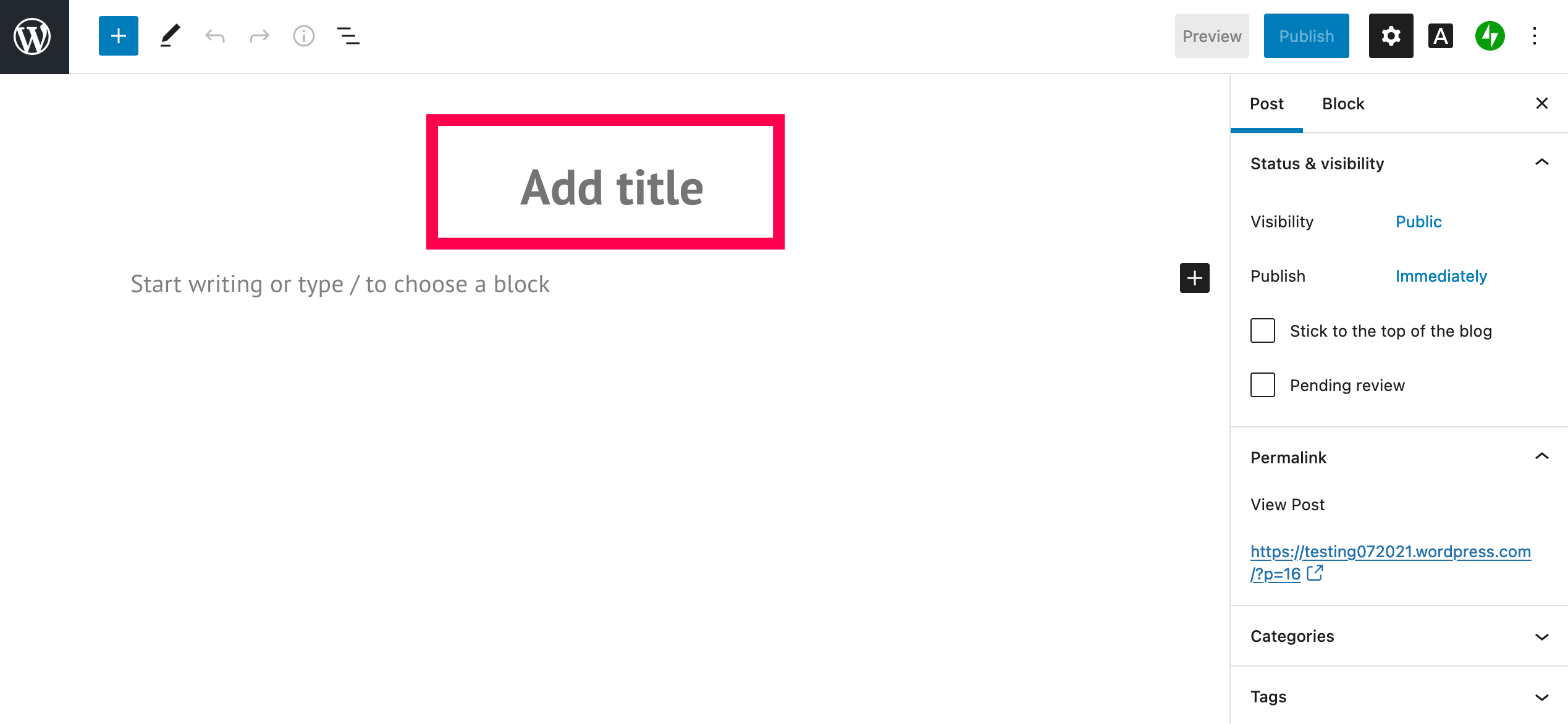 - If you already know the title of your post (something descriptive and eye-catching), click ‘Add title’ and start typing.