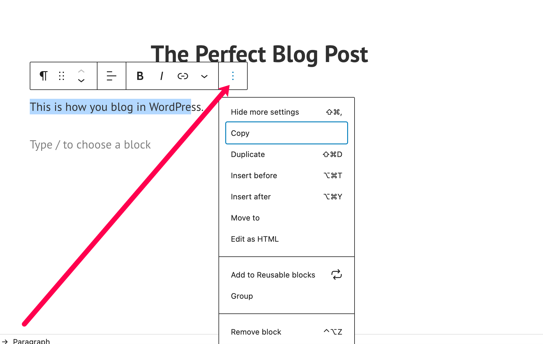 - Click the three vertical dots to remove an entire block, duplicate it, and more.