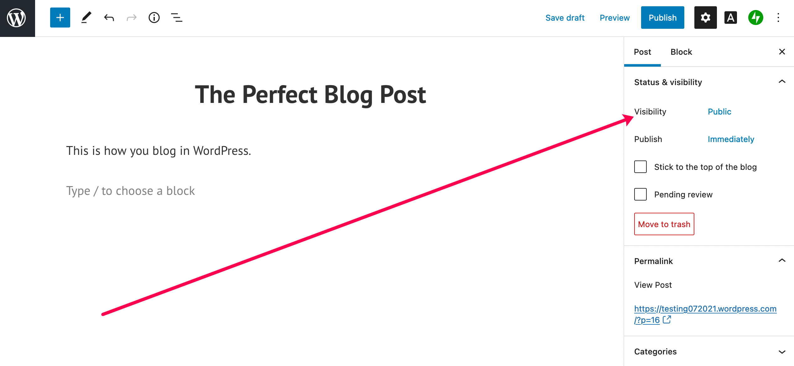 - Update your visibility. You can select ‘Public,’ ‘Private,’ or ‘Password Protected.’ Note: If you don’t want everyone to see your blog just yet, check the ‘Pending review’ box and you can go back and edit your post before publishing.