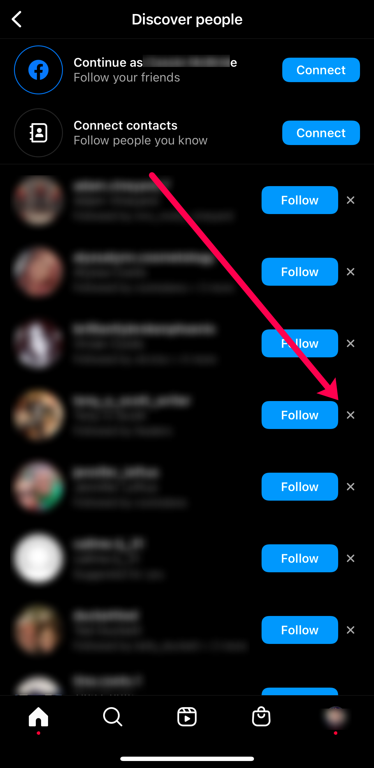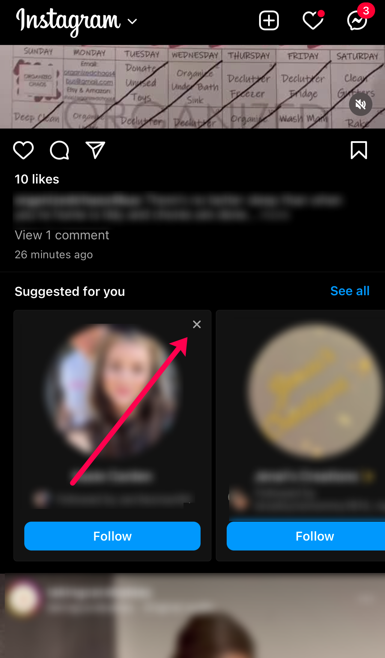 - Find the Suggested friends section in your Instagram feed. Then, tap the x in the upper right corner of each friend.