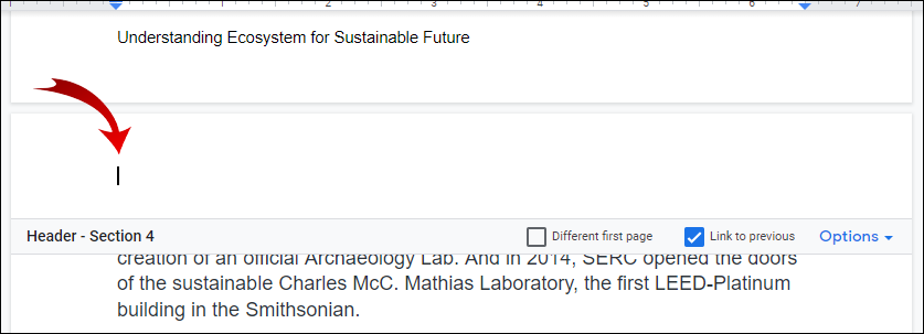 • From the header options that appear, make sure to uncheck the Link to previous option. This will set your header to behave as a separate document – you can format it any way you want.