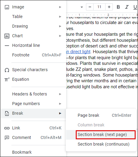 - From the dropdown menu, choose the Break option and then click on Section break (next page).