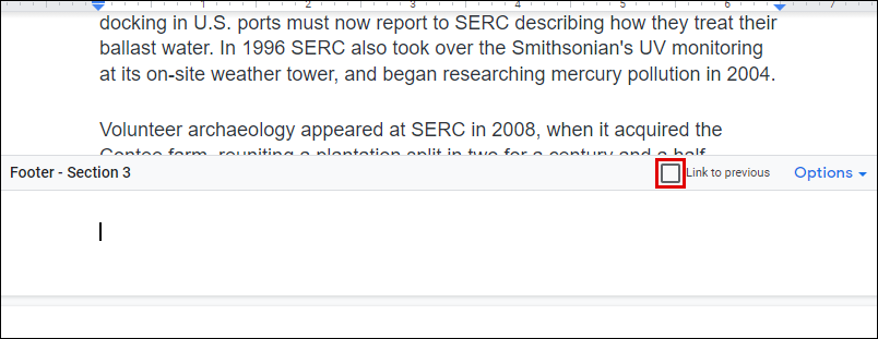 - From the footer options that appear, make sure to uncheck the Link to previous option. This will set your footer to behave as a separate document – you can format it any way you want.
