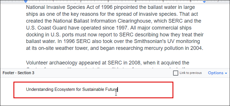 This will now create a new footer on all your Google Docs pages.