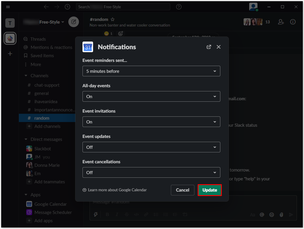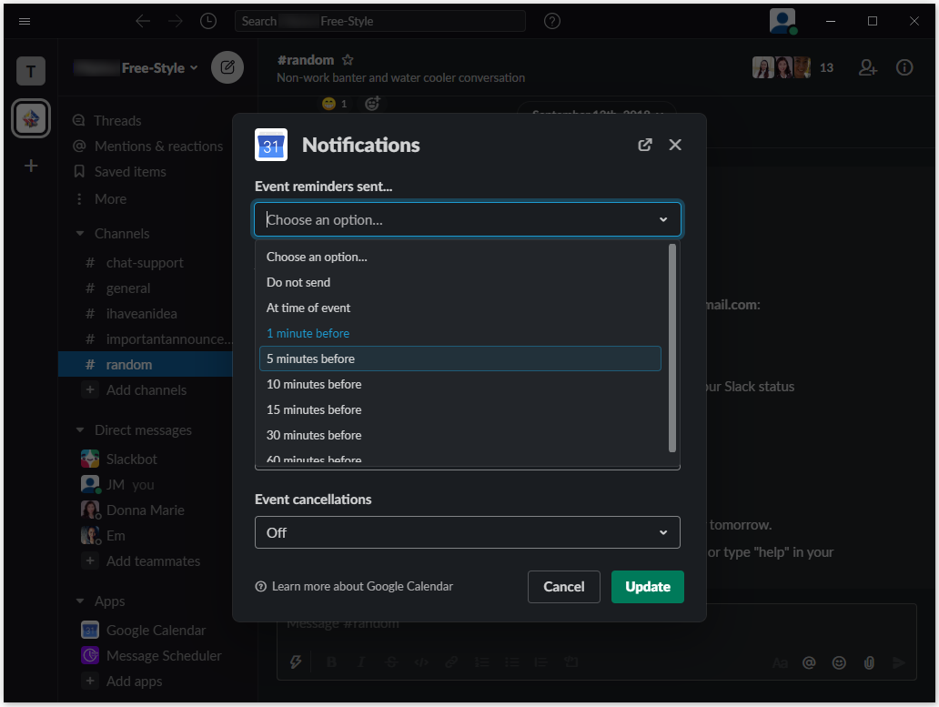This is just an example of how you can use this cool Google tool on Slack. You can set the app to post reminders for specific channels, for the “#general” channel, or only to you. The channels with which you’ve shared a Google Calendar will also receive automatic reminders and updates when events are changed.