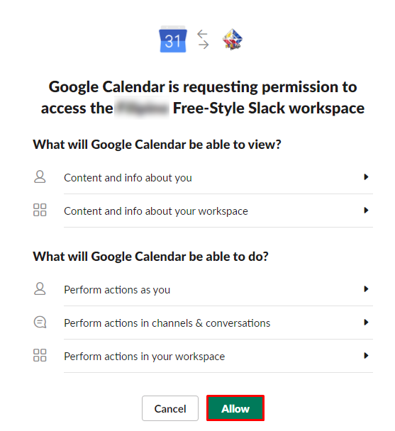 - Grant Google Calendar access to your workspace by clicking “Allow.”