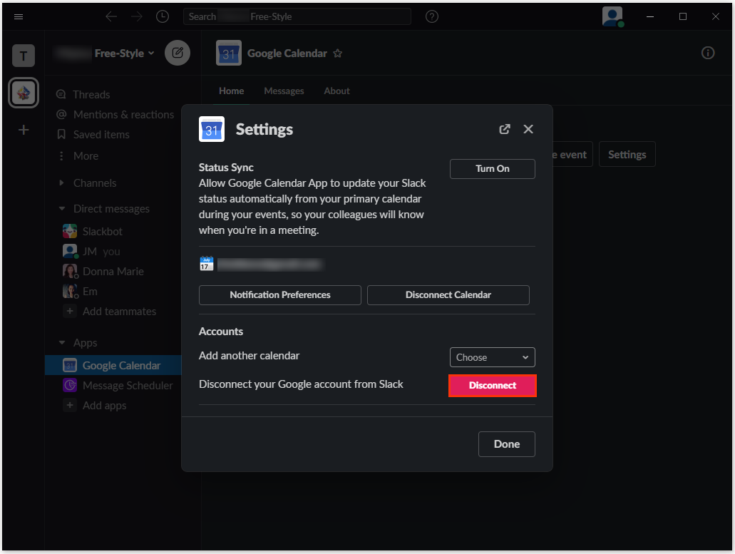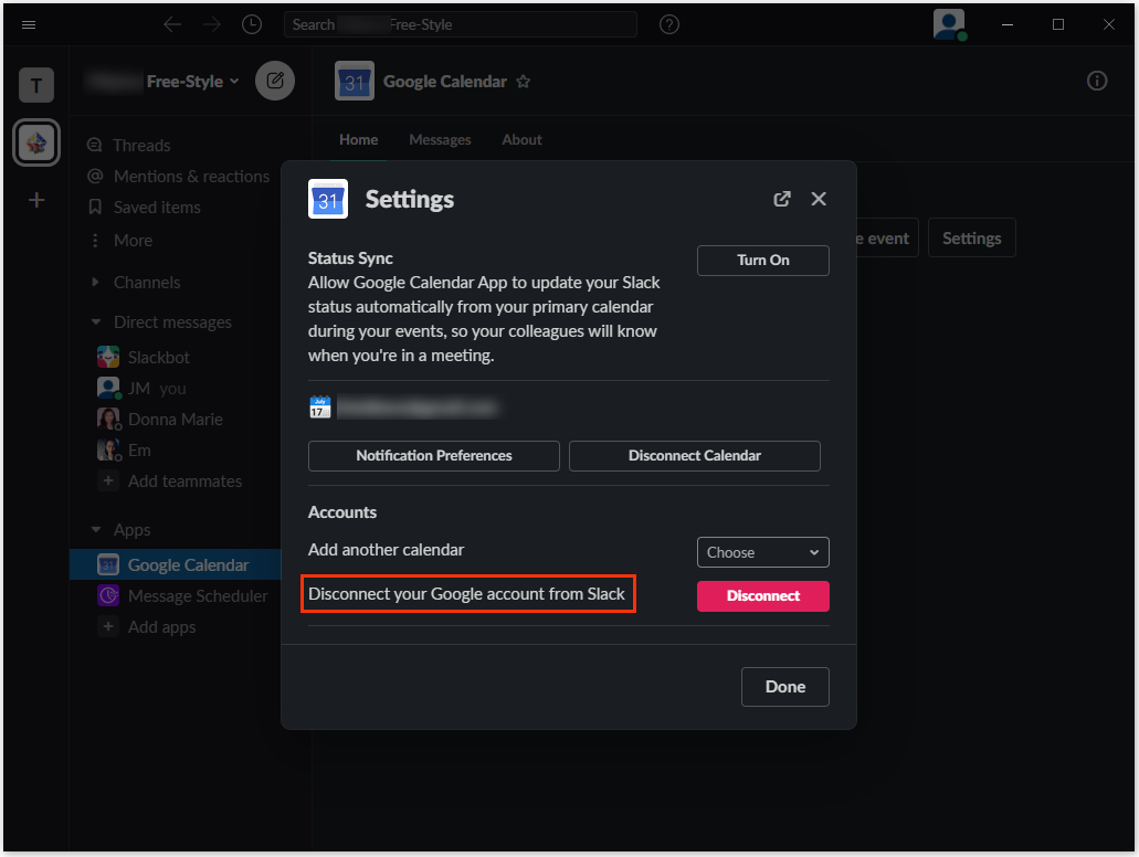- Scroll down to the “Disconnect your Google account from Slack.”