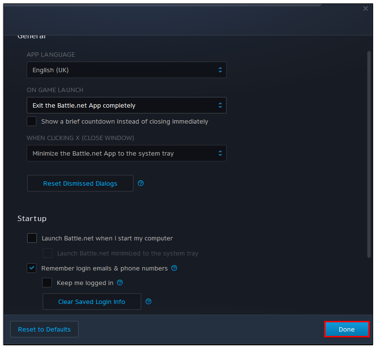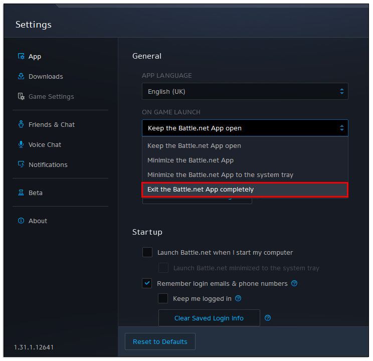 - In the “When I launch the game” setting, select “Exit Battle.net completely.”