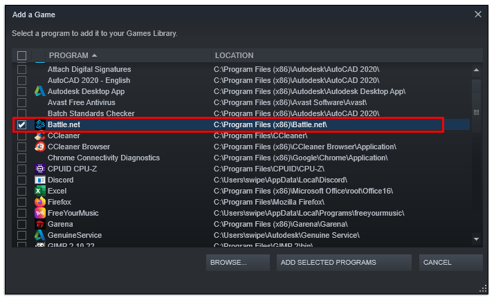 - Add the Battle.net program (not the “Battle.net Launcher”) as a non-Steam game following the process noted above. You’ll probably need to find the app on your drive using the Browse button. The OS usually puts it in the “Program Files” or “Program Files (x86)” folder depending on your system configuration.