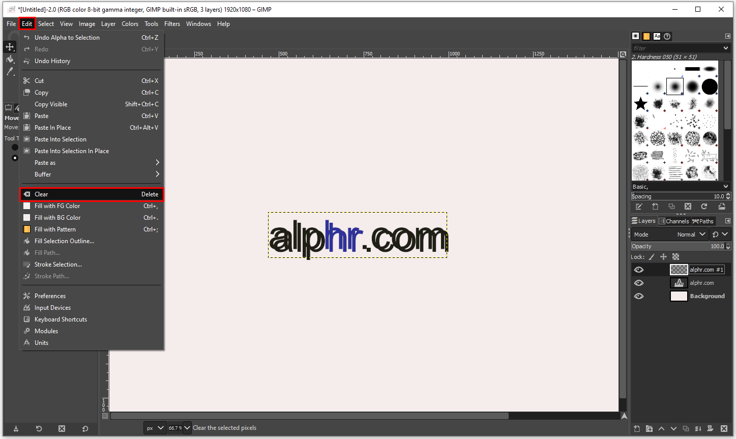 - When you see “marching ants” around the text, click on the upper text layer, and then click on “Edit” and “Clear.”