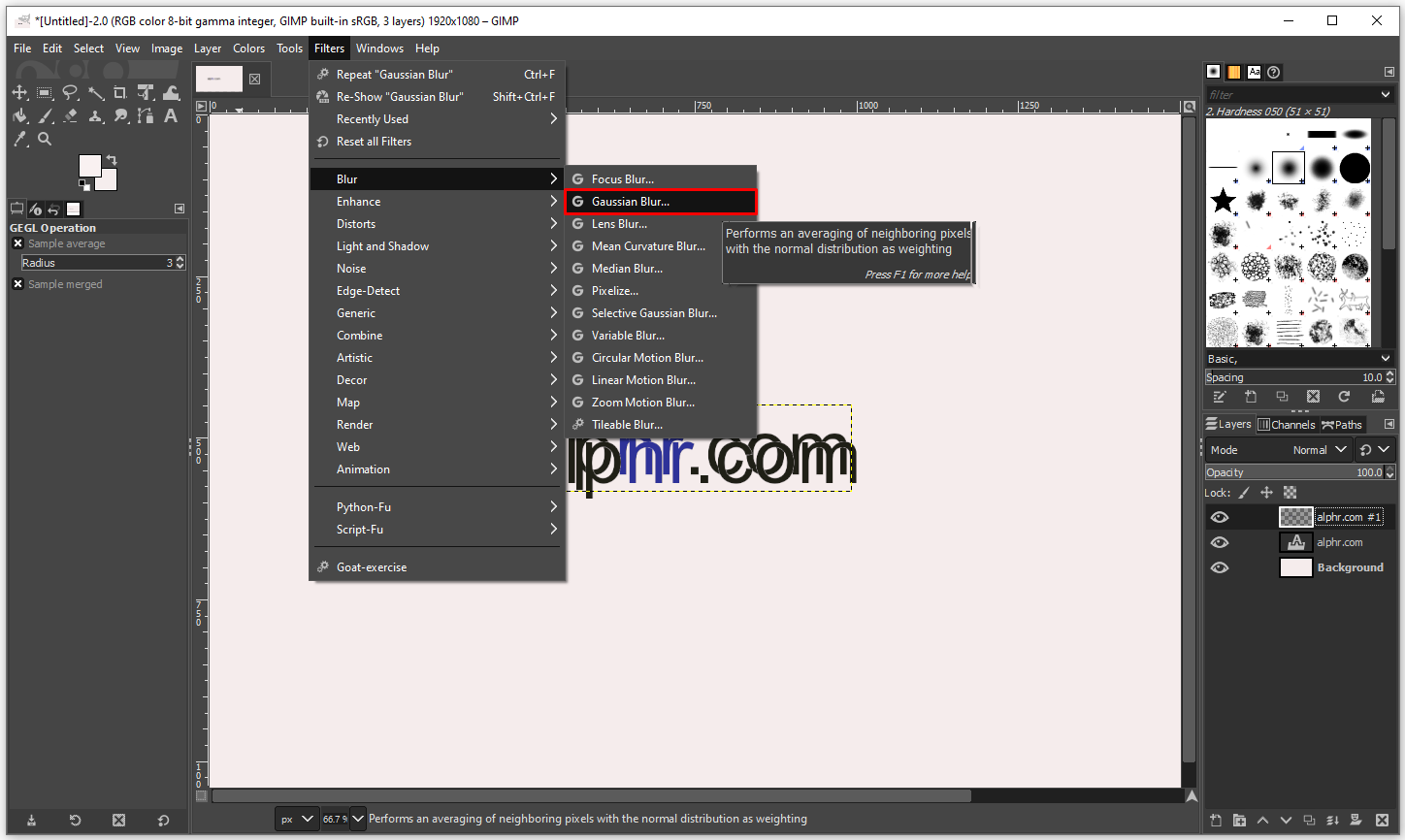 - Select the upper layer, go to “Filters,” “Blur,” and “Gaussian Blur.”