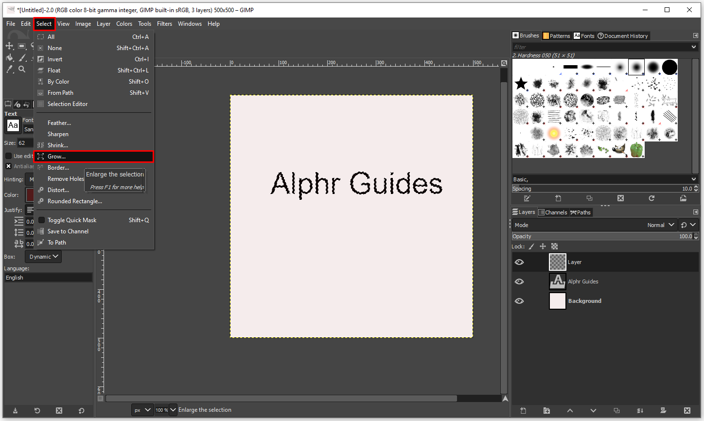 - To create an outline, you’ll need to increase the text’s size in the transparent layer. Click on “Select” and “Grow.”