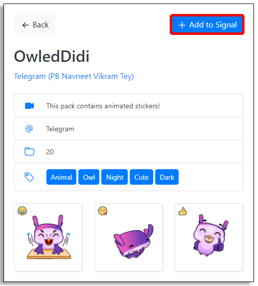 - Users can here find regular or animated stickers. Tap on the sticker you like and click on the “Add to Signal” button in the top right.