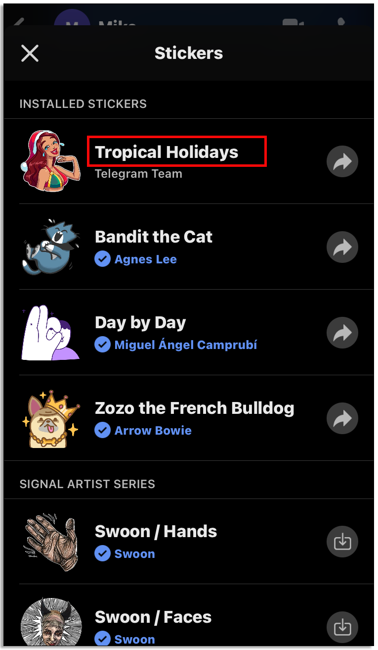 - Once you find the ones you like, hit to download them. The button is a downward arrow on the right of the stickers.