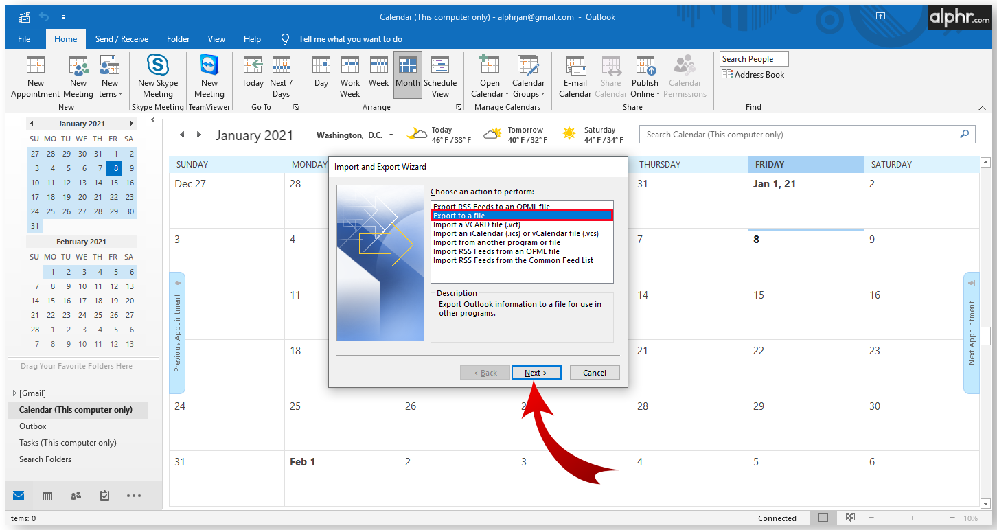 3. In the Import/Export Wizard, choose Export to a file.