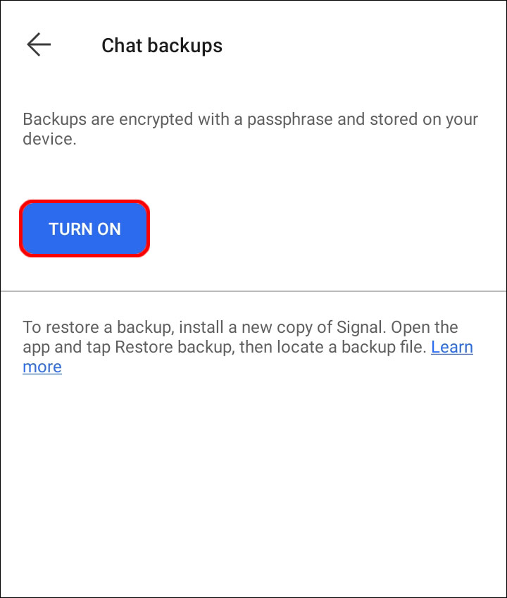 - To enable a backup on your old device, click your profile icon and select “Signal Settings”, “Chats and media”, then “Chat backups”, and press “Turn on”.