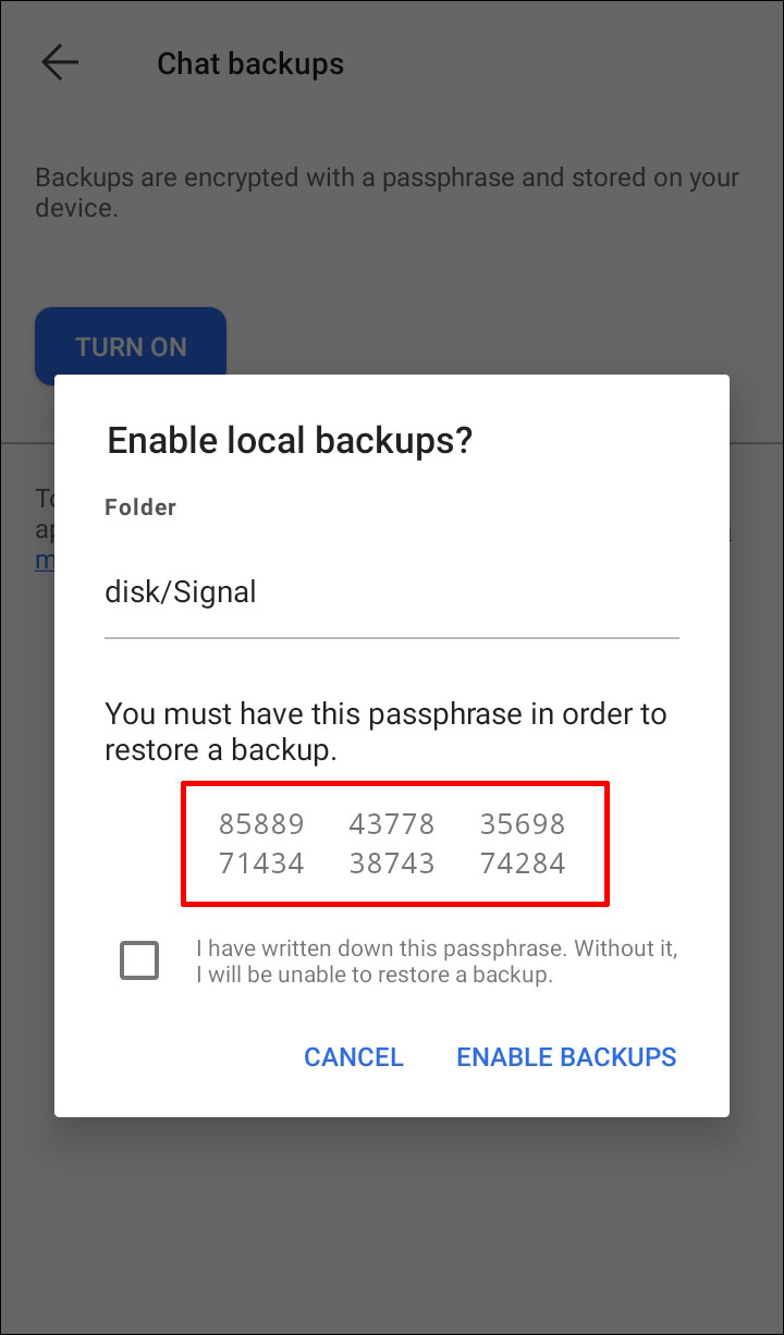 If your last backup information says “Never”, you have to make sure that app permissions and backups are enabled. To do that, visit your phone’s settings, locate the Signal app permissions and turn all of them on. Try freeing up some space on your device and remove your SD card so that the backup can be saved to the device’s internal memory instead.