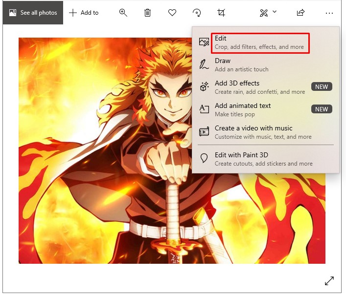 Windows 10 also comes with the Photos app, which has a built-in option for image editing. To blur the background of the image there, follow these steps: