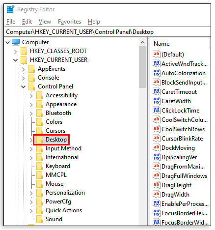 - Navigate to HKEY_CURRENT_USER\Control Panel\Desktop and select “Desktop directory,” not expanding it.