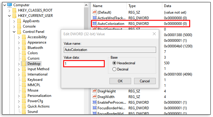 - Double-click “Auto Colorization”, then change the Value Data to “1”.