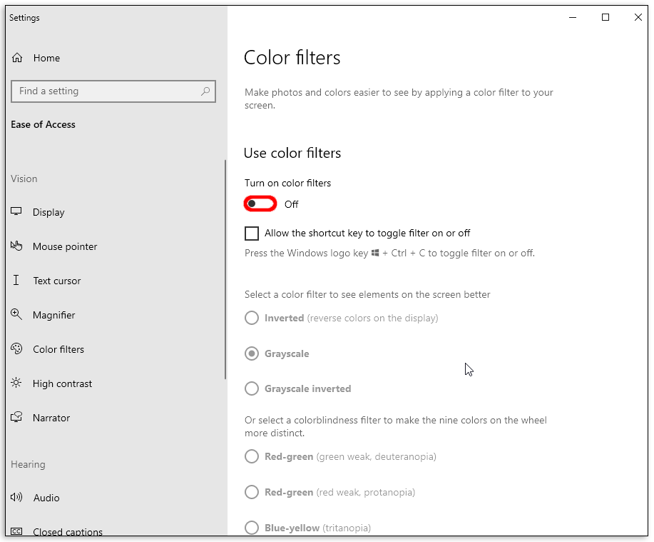 • Find “Turn on color filters” and turn off the toggle button beside it.