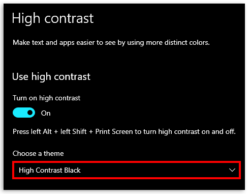 • Select the “Turn on high contrast” toggle button again. Windows may display a “Please wait” screen between the steps. To quickly switch from the high contrast to ordinary mode, press the left Alt key + left Shift key + Print screen.
