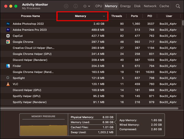- Click on the “Memory Column” to check RAM composition and identify any app that may be overworking the RAM.