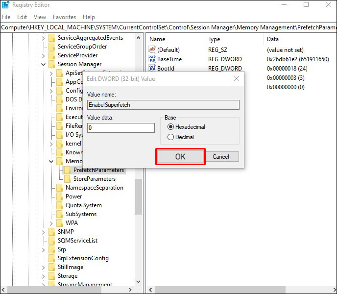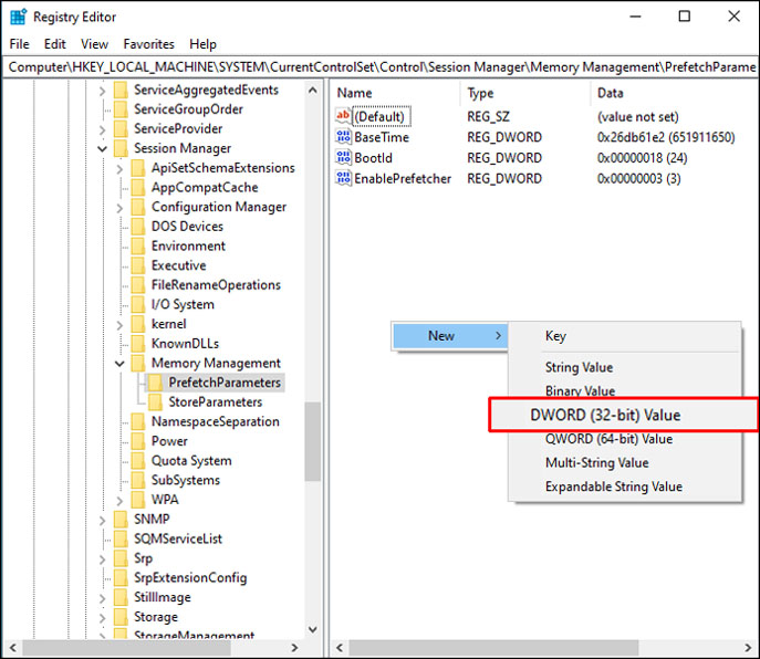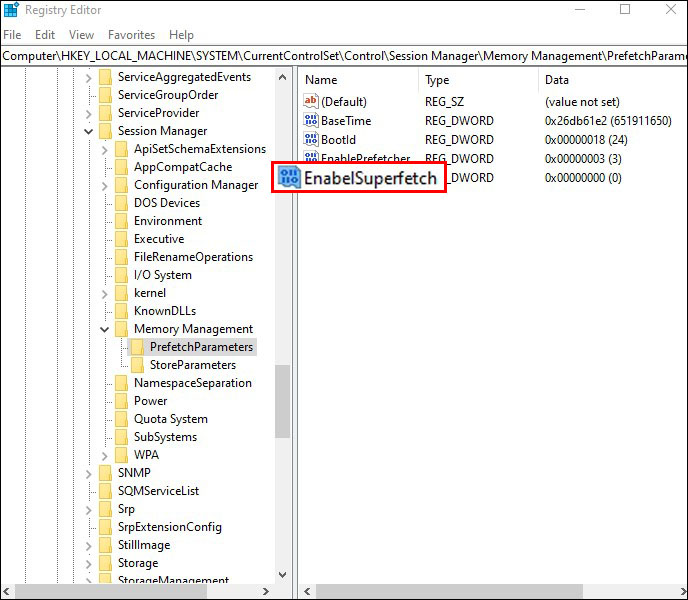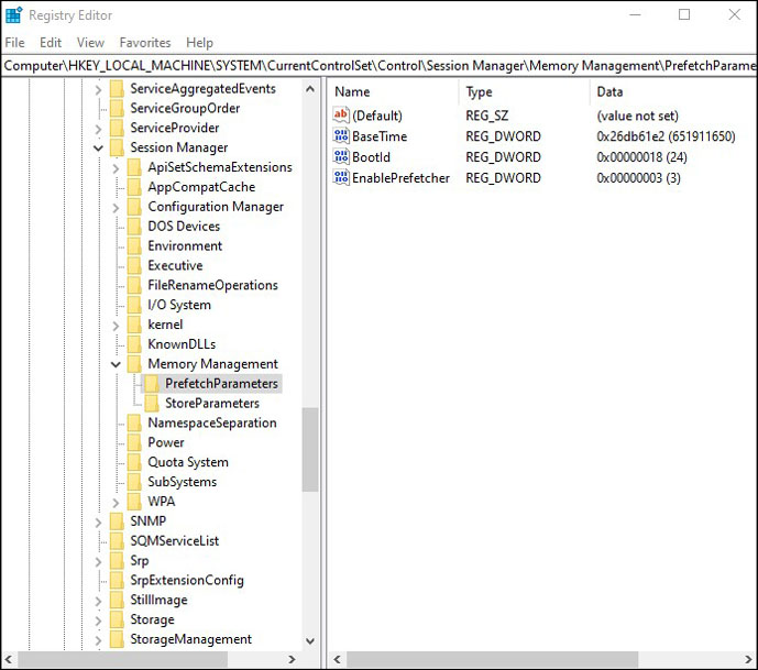 - In the Registry Editor, browse to HKLM\SYSTEM\CurrentControlSet\Control\Session Manager\Memory Management\PrefetchParameters.