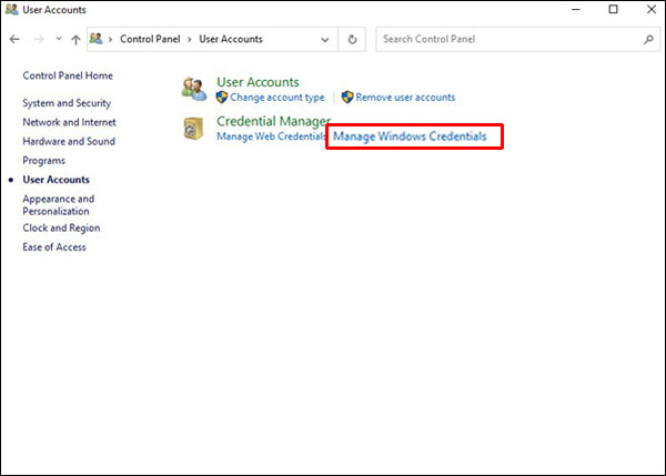 - Choosing the Manage Windows Credentials type brings up a list of your stored credentials for network shares, remote desktop connections, or mapped drives.