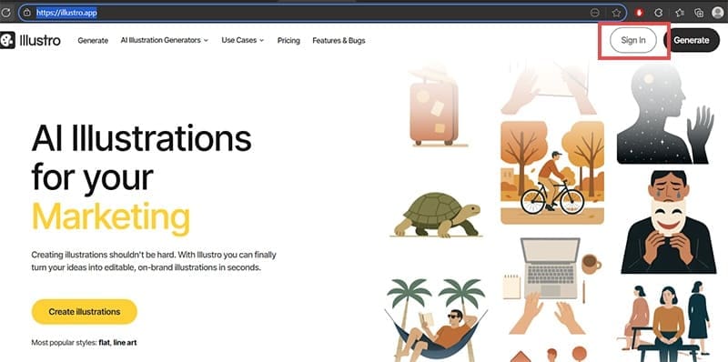 Step 1. Go to Illustro’s home page and click on “Sign in” (You can try anything else, but it will be basically a preview and you’ll still need to make an account).