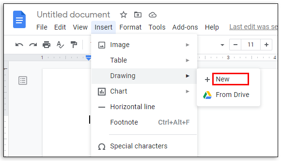 - Click on “Insert,” “Drawing,” and then “New.”