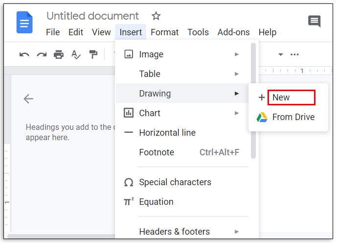 2. Choose “Insert” and then “Drawing.” Select “New.”